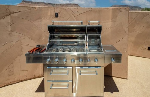 This Cliff Dwelling has 1 King bed and a sofa sleeper with an indoor bathroom and kitchenette. The open rooftop has a fire table with chairs, a gas BBQ grill and a hot tub.