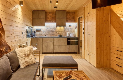 "Luxe Timber Lodge & Pet Retreat", 3-room chalet. Very beautiful and tasteful furnishings: living/dining room with 1 sofabed, Scandinavian wood stove, dining table and TV. Kitchenette (2 hot plates, oven, toaster, kettle, microwave, electric coffee machine, Capsules for coffee machine (Tchibo)). Shower/WC. Electric heating, wood heating, floor heating. Upper floor: 1 room with 1 double bed. 1 room with 2 beds. Exit to the balcony. Balcony. Balcony furniture, barbecue. Facilities: Internet (WiFi, free). Please note: suitable for families. Non-smoking house. 1 small pet/ dog allowed. Built-in bluetooth audio system and central touch control of lighting and temperature conveniently from the living room.