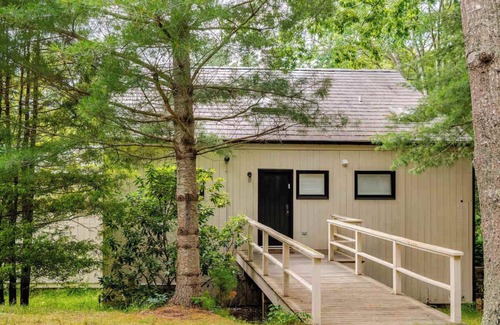 Barns Crossing features a stunning main house with a 28-foot timber-framed barn structure at its center. The living area boasts a 36-foot high Pennsylvania fieldstone fireplace with a custom steel beam above the hearth and a wall of windows providing ample natural light. The main house includes a spacious living room, a fully equipped gourmet eat-in kitchen, and a butler's bar.