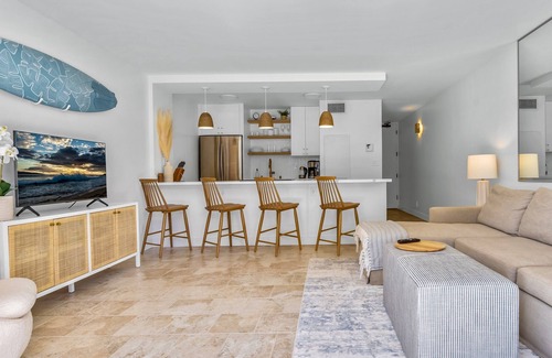 A minimalist, modern beachy retreat with high quality touches. From the Ritz Carlton king mattress in the bedroom, to the rainfall shower, to a new high-end kitchen, every detail has been obsessed over. You will feel right at home watching a movie at night on the comfy sectional, which converts to queen sized hideaway/pull out bed