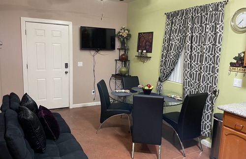 The house is equipped with 1 Queen & futon. There is WIFI, TV, with Roku. Everything you need; plates, silverware, towels etc. The desert style landscaped backyard has tables, chairs for lounging. It is a friendly private neighborhood that is 7 min from Harry Reid International Airport, 10 min from the famous strip, Mandalay Bay Hotel and Casino, Luxor, New York New York, MGM Grand, Excalibur, Cosmopolitan, Vdara . 12-15 min from Fashion Show mall and convention center. Fremont Street Experience, SLS Hotel and Casino.