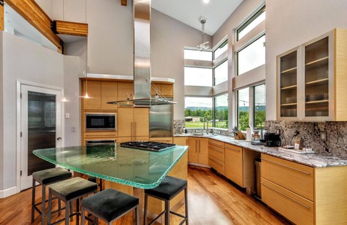 As you enter the home, you'll be greeted by a large, original painting by Alaskan artist Bill Brody. In front of you will be the well appointed kitchen equipped with all high-end appliances, as well as an instant pot with air fryer capabilities. Cook with some of the fresh herbs growing in the planters on the back deck. When in season, you'll find sage, rosemary, thyme, mint, chives, and parsley. You'll be provided with a sample of locally roasted coffee from Farm Loop Coffee and a complete Chemex brewing system. You can watch the planes taking off and landing from the kitchen windows.