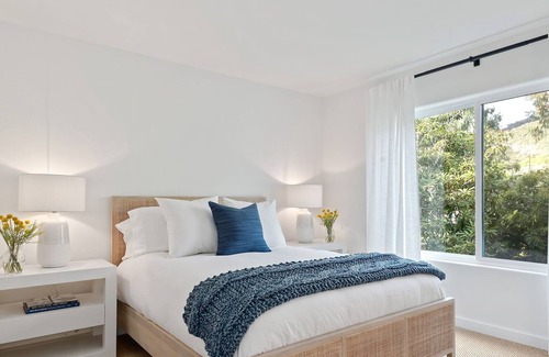The kitchen with breakfast bar is efficient and fully stocked, making meal preparation, picnic packing, or late-night snacking effortless. Stacking full-size washer and dryer add more convenience especially for those staying all season. With an abundance of local nurseries in the area, and weekly farmer's markets, having locally grown produce and fresh flowers on the table is made easy.