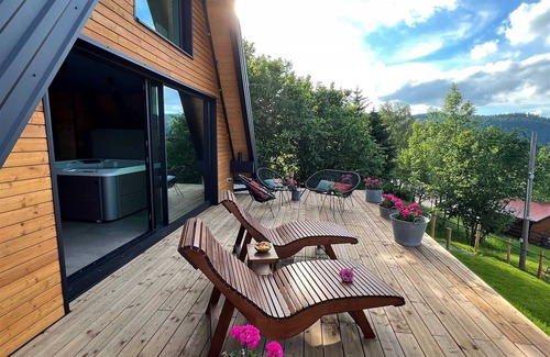 Luxury Cottage is a beautiful wooden cottage of your dreams. Numerous unique handmade details show the amount of the owner’s effort and dedication in creating a warm mountain home. Custom-made wooden furniture tells a special story and additionally contributes to the atmosphere. It can accommodate a maximum of 6 people and its size is ideal for families or small groups. Guests have three relaxation areas at their disposal, two bedrooms and an extra bed in the gallery. The gallery is ideal for relaxing, enjoying the smell of wood or for playing board games. You will enjoy the fireplace area and an unforgettable view of the surrounding hills and the Slovenian Alps in the living room. There is a wellness area with jacuzzi, sauna and sunbeds behind the house. After relaxing in the wellness area, we suggest relaxing at the bar in the tavern or the large gazebo for outdoor enthusiasts. For the youngest, there is a children's playground and bicycles, and it is also possible to rent a Quad and further explore the surroundings.