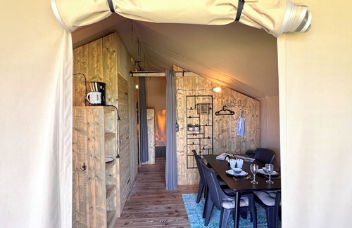 Discover the perfect balance between adventure and comfort and stay in one of the beautiful safari tents at Camping de Vuurkuil in the Veluwe. The tent is suitable for four people, is very spacious and comfortably furnished, and has a kitchenette, bathroom, sleeping cabin with a double bed, and sleeping cabin with a bunk bed. At the front of the tent is a lovely terrace, where you can relax with a view of the camping field where the other five safari tents are also located
