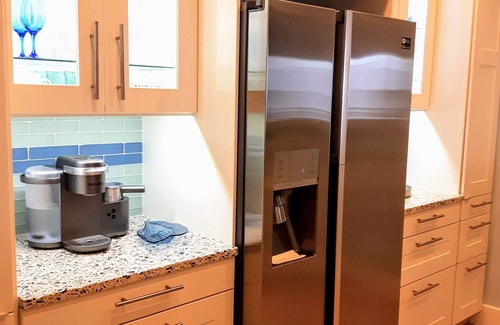 Our kitchen features high end stainless steel appliances and a Keurig Coffee station with frothier.