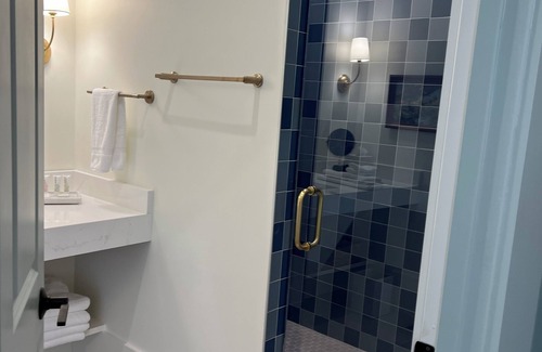 Our luxury Apollo suite offers a spacious and elegantly designed retreat, featuring plush furnishings, large windows, a king sized bed, and a lavish en-suite bathroom with large walk in shower and ample counter space. This guest room is located at the rear of the Inn in the new addition. It has the charm of being in a historic inn with brand new accomodations. The 415 sq ft room features a king sized bed and ensuite bathroom with spacious walk in shower. Enjoy the convenience of modern amenities, including high-speed Wi-Fi, a flat-screen TV, and mini fridge. Option to connect with Atlas guest room for two king guest rooms.