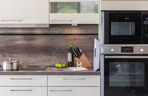 Open, fully equipped kitchen: - Incl. Induction hob, dishwasher, refrigerator + freezer, microwave, convection oven, coffee maker, toaster, kettle & Nespresso coffee machine (capsules please bring your own) - High quality crockery, glasses, cutlery, pots, pans & many other useful cooking utensils - Separate pantry (kitchen area)