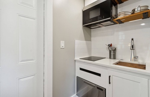 Inside, you'll find a kitchenette with a two-burner induction cooktop, dishwasher, microwave, sink, and a mini-fridge with separate freezer. A coffee station with a coffee maker and tea kettle, along with a full set of dishes and cookware for two, ensures everything you need for a seamless stay.