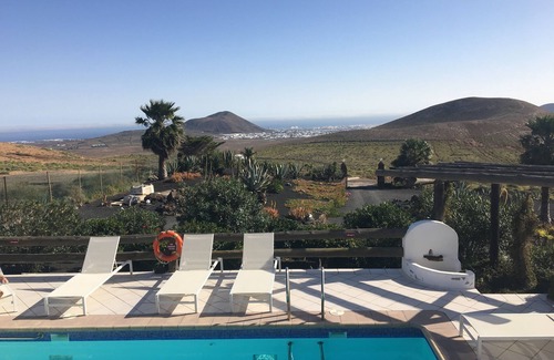 Villa Viha is a lovely property, very privately situated on the top of a rural area. The house is 316sqm and the garden is 5800sqm. It sleeps 10 guests. It has a large poolarea and several fantastic terraces. The views are just amazing. You can see the sea and 22 vulcano tops! The city you see in front of the largest terracce is Arreciffe which is 10 minutes drive away, and the village on the side is Nazaret, 2 minutes drive or about 10 minutes walk away. That´s where the museum and cool restaurant Lagomar is situated and also an Italian restaurant called La Forgia. You have the airport 15 minutes drive away, the closest beach Costa Teguise 8 minutes drive away and Famara Beach 15 if you want to surf.