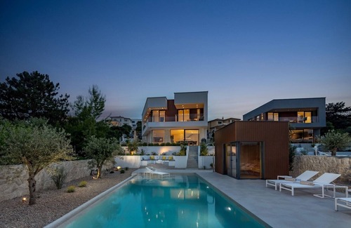 Luxury Villa Krk 2 Vrbnik with heated pool, jacuzzi and sauna is located in Vrbnik, on Krk, the largest island in Croatia, just 250 m from the sea and just 12 minutes walk the beach. This modern luxury villa is the perfect place to explore the rich history of Vrbnik and enjoy Vrbnička žlahtina, a high quality white wine produced only in this area. Guests also have access to and outdoor heated pool, a sand sports court, complete with a sea view and a beautiful olive grove.