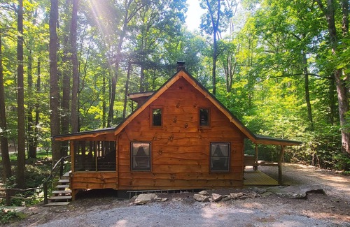 Ma and Pa’s is our newest, largest, and only wheelchair-accessible cabin. Ma and Pa’s is larger in size than the others has central heat and air conditioning, and features a large L-shaped screened porch with extra outdoor seating. From its private perch on the side of the mountain. Ma and Pa’s provides the perfect retreat for a relaxing, peaceful vacation. This cabin sleeps 7-8 comfortably with a king-size bed and a twin bed plus trundles in the downstairs bedroom and has a full, a twin, and a twin sleeper sofa in the loft. The loft is accessible by a wide staircase in this cabin. Other features include a large fully-equipped kitchen with a full-size oven, fridge, coffee maker, and microwave, a bathroom with shower and heated tile floor, and ceiling fans in each bedroom and living area. It has a small back porch with a bench. There is a buck stove. Please bring your own firewood and fire-starting materials--paper, kindling, etc. (Liquid fire starters are STRICTLY PROHIBITED.)