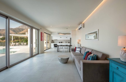It offers an infinity pool, free Wi-Fi, private parking, a large outdoor terrace with barbecue area and a garden. A stunning open plan area overlooking the sea with a cosy living, kitchen and dining area, with sliding panoramic windows that give an amazing "inside out" experience. The fully equipped kitchen meets the needs of the most demanding guests.