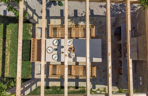 The magical exterior of the villa offers a spacious outdoor pool with an incredible panoramic view of the surrounding hills. There are also associated deckchairs for all-day lounging in the sun. In the spacious yard, you will also find a grill area with an outdoor dining table, as well as a separate shed for the safe storage of your bicycles.