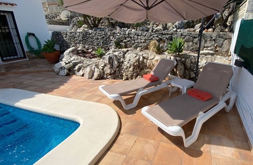 At equal distance from Valencia and Alicante, the villa on 110m2 with all mod cons and 7a garden is situated in Orba in the residential area of La Plana Alta. The house is built on 2 levels, only the main level is rented out. The lower apartment is not occupied during rentals. From the Naya (covered terrace) or the edge of the private swimming pool (4x8m), you have an outstanding view over the valley of Orba (with lemon, orange, almond, olive trees) and the Mediterranean sea in the background. Our house has 2 bedrooms with new A/C, 1 with double bed (with an extra bed for a 5th person), the other with 2 single beds. Living room, dining room, bathroom with shower / toilet and washing machine. The fully equipped kitchen gives you direct access to the pool and terrace. A gas plancha is at disposal on the the lower terrace. Petanque track of 1,5x9m with a stone table and benches next.