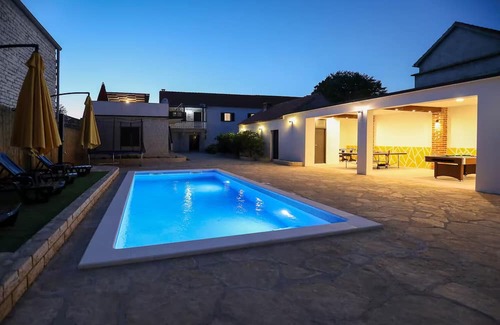 Relax in two elegant, fully equipped villas on an exclusive estate featuring a private pool, a jacuzzi, and a game room with billiards, table tennis, and darts. This unique property can accommodate up to 15 guests and is designed for privacy, relaxation, and fun — just 5 minutes from the sea and 25 minutes from the historic city of Zadar.