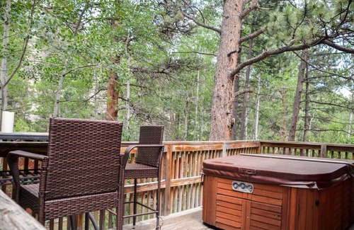 The old-school, bite-sized Marmot Mini Cabin is nestled overlooking the Big Thompson River and has everything you need and nothing you don't: a kitchenette including all the kitchen basics except for a full-size oven (you’ll have a small Ninja oven), a queen-sized bed, a private efficiency bath, a TV, and a private deck space complete with a grill and private hot tub. At 170 square feet, it's perfect for groups of 1-2 who don't mind a little coziness.