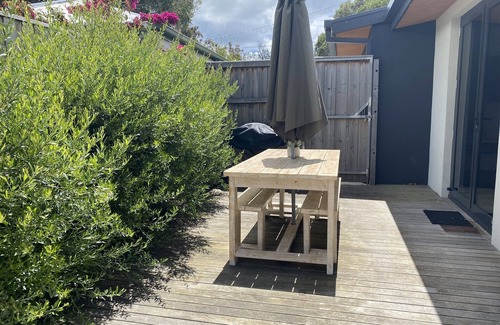 The main lounge, dining and kitchen area is airconditioned and opens to a rear deck area which has an outdoor setting and BBQ. The lounge has a TV and cosy gas log fire for the cooler days. Cooking is easy in the fully equipped kitchen with oven, gas cooktop, microwave and full size fridge and freezer.