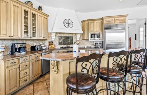 A stylish stay awaits at this gorgeous, Mediterranean-inspired home, just across the street from private beach access and surrounded by popular shops like Surf Hut, restaurants, and other amenities. Spend time outside sipping coffee on the shady, covered balcony while the ceiling fan keeps it breezy - or venture just a little over a mile to Bad Ass Coffee to get your caffeine fix. Inside, the elegant, open living space is flooded with natural light, thanks to the wall of windows leading to the balcony. The chef will love the spacious, full kitchen, appointed with sleek stainless steel appliances and lots of counter space. Grab a bite at the glass-top table or perch at the kitchen island when it's time to eat. A convenient desk set up behind the couch features outlets and USB plugs, so you don't have to miss a minute of your shows while you finish up some remote work or post the day's pics to social media. Head out and explore with the provided golf cart. When bedtime calls, the primary bedroom has an en suite bathroom, and there's even a fun bunk room the kids will love.