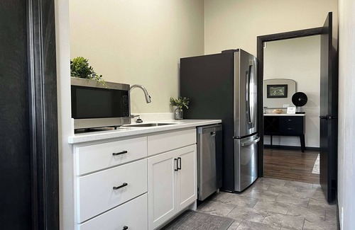 Main floor: Bedroom with King bed, smart TV and pack-n-play. Full bath with tub/shower combo, accessible from the common area. Full size sleeper sofa (linens provided) in the living room. Additional counter, sink & mirror in the entry allows space for getting ready.