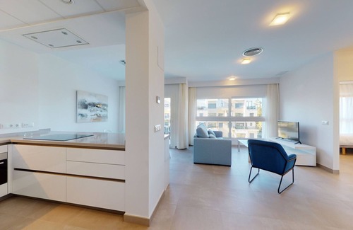 3 Bedrooms Apartment on the second floor of the residential complex Sevilla VII, with open plan kitchen fully equipped and a spacious open-air terrace. The residential complex has a communal pool, large garden areas and allocated parking space. It is located only 900 metres from the fine sandy beach and 300 metres from the Centro Ecuestre Oliva Nova.