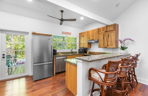This charming two-story cottage offers 3 bedrooms and 2.5 baths that will meet all of your creature comfort needs. Enter through your private white picket gated fence and let your vacation plans unfold on the cozy front porch as you sway on the swing with a cocktail in hand. As you enter the home, abundant natural light plays across the interior's vaulted ceilings while the modern and updated living and dining areas boast an outstanding space for entertaining loved ones. The dine in kitchen features stainless appliances, granite counters, a breakfast bar with seating for 3 and the gathering area is fully stocked to satisfy all of your cooking pleasures. The living area off the kitchen is an ideal spot for sinking down on plush seating while sipping on your chilled cocktail and feasting on your favorite tv shows. Slider doors merge your indoor with your outdoor living in classic Key West style. A powder room is situated just off the living area for your convenience.