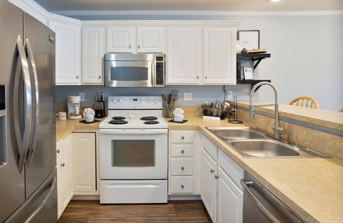 Only 8 steps down to the unit you will enjoy the kitchen stocked with everything you would need to stay for a couple days or a week or more! The Laundry/Utility room located adjacent to kitchen. Dining Room seats 6 people with 3 more at the breakfast bar. Great for a good meal or a game of cards!