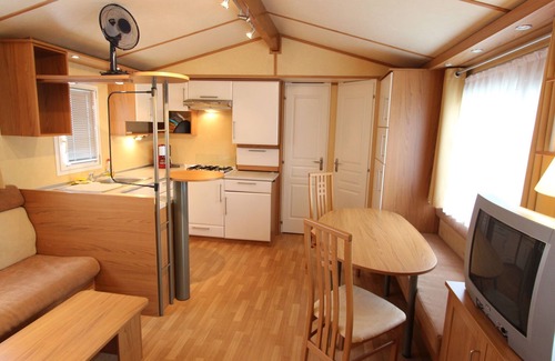 It has a living/dining kitchen with a sofa bed, 2 bedrooms, 1 bathroom and a wooden terrace with garden furniture, and you can use the complex's leisure facilities, including the natural pond, the leisure room, the drinks menu, the playgrounds and of course the sanitary facilities.