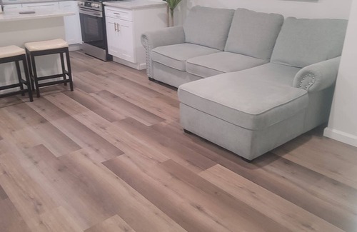 As you step inside, you’ll be welcomed by a comfortable living room and an open-concept kitchen—perfect for relaxing or cooking a meal. The living area features a sofa that converts into a full-size bed, and a smart TV with WiFi access, offering free movies and shows through platforms like Peacock and NOW TV Latino.