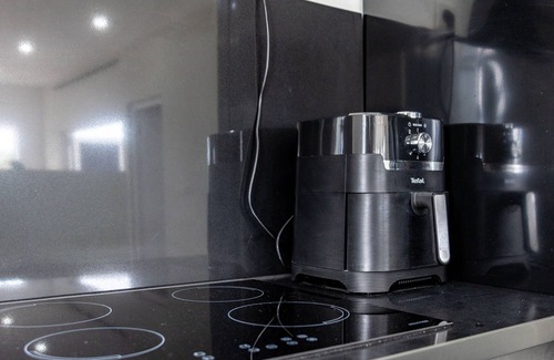 The kitchen has a fridge, a hob, an oven, a kettle, a coffee maker, a dishwasher, a freezer and a microwave.