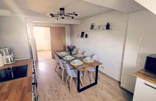 Feel at home in our cozy apartment "Silvia" for up to 8 people! Modern 4 room apartment with large kitchen, living room and 3 separate bedrooms. There is free parking for you in the back yard. On 75 sqm you live in the beautiful attic with 3 bedrooms.