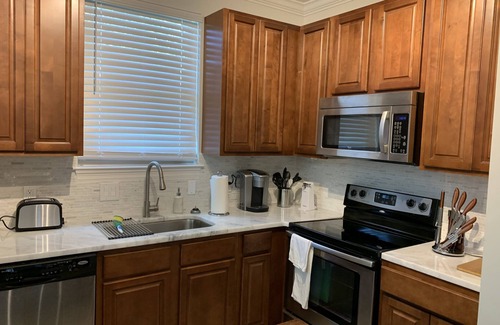 Recently renovated 1 bedroom, 1 bath 2nd floor apartment in Midtown. All new luxury vinyl plank flooring, custom walk in shower with rainfall shower head and handheld sprayer, marble countertops, walnut cabinets with soft close feature, custom marble backsplash, led track lighting, remote ceiling fan, upholstered king bed with 12" memory foam mattress, stainless steel appliances, keyless entry, USB ports in kitchen and bedrooms, two 49" smart tv's, wifi and cable in the den, keurig elite!