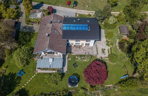 Situated in the village Mauerham, only a short walk from the lake “Tachinger See”, the charming apartment Linde, which is part of the Straßer holiday residence, is the perfect accommodation for quiet and relaxing holidays in this beautiful part of Bavaria. The light-flooded attic apartment with high-quality equipment consists of a living room with a sofa bed, a well-equipped kitchen with a dishwasher and a dining area, one bedroom as well as one bathroom with a walk-in rain shower and a separate toilet. Therefore, the apartment can accommodate 4 people. Additional amenities include Wi-Fi, satellite and cable television, a children's bed and a highchair. From the apartment, you will have a great view onto the surrounding mountains and the lake. The lovely 3000 m² garden is shared with the 3 other apartments of the residence and boasts a fish pond, table tennis and a playground as well as a paddling pool for children. The shared outdoor dining area invites you to spend the evenings with tasty barbecued meats or fresh fish. Only a 6-minute walk (600 m) away along a footpath, you will get to the residence’s private beach, where you can lie in the sun and take refreshing swims in the lake while enjoying the wonderful mountain panorama. The nearest supermarket and a restaurant serving local dishes can be found a 3-minute drive (2.1 km) in Taching am See. Waging am See, a quaint town on the Waginger See with many cafés and restaurants, is located a 10-minute drive (6.2 km) from the apartment. Furthermore, Mozart’s native town Salzburg can be reached after a 40-minute drive (37 km), and the famous lake Chiemsee is a 25-minute drive (25 km) west of Mauerham.