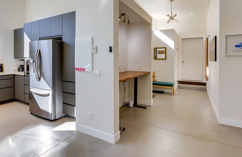 HOME FEATURES: Flat-screen TV, standing desk, dining table w/ chandelier, books, board games, ceiling fans, contemporary decor