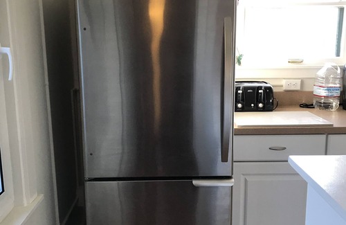 Features include large bathroom with vanity, mirrored medicine cabinet & light bar, shower and storage closet. Bedroom area has queen size sled bed, large closet with organizer, iron and board, air conditioner, nightstands, and room darkening, cordless blinds. Living room has dividing screen, futon (which folds down to a full bed), wicker easy chair, and wicker rocking chair, coat and shoe rack, flat screen smart TV with WiFi connection and local channels, Alaska magazines, books & pictures, along with puzzles and card games. Kitchen has large peninsula with four comfortable counter stools, lots of white cabinets, including one with glass-front, stainless-steel appliances, microwave, and double sinks. It has a Keurig coffee maker, toaster, some cooking seasonings and supplies, kitchen utensils, dishes, and cookware. Floors in bedroom area and living room are hardwood; in kitchen and bathroom there are wood-look vinyl plank floors.