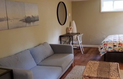 The room is VERY spacious. It’s in the basement and lots of privacy from the whole house. Guests would have their own private entrance to the space from the back of the house. When guests enter the house, they cross an unfinished part of the basement to access the room.