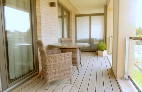 The east-facing balcony stretches across the width of the apartment and is accessible from both the living-dining area and the bedroom. Here cozy garden furniture is waiting for your time out.