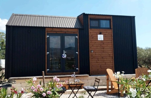 This tiny house Italia getaway is a 221-square-foot tiny home featuring an open rectangular area, nestled at the edge of an olive grove. It offers easy access to water, split air conditioning, a kitchenette with cooking equipment, and excellent bathroom facilities. These amenities include an eco-friendly cassette toilet with a removable waste holding tank, hand basin, and shower (electric-heated for hot showers).