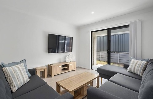 Relax comfortably in air-conditioned open plan living with stylish lounges, a big screen Smart TV and a 6-seater dining table. The modern kitchen is equipped with dishwasher, oven, cooktop, microwave, double door fridge/freezer, coffee machine and breakfast bench.