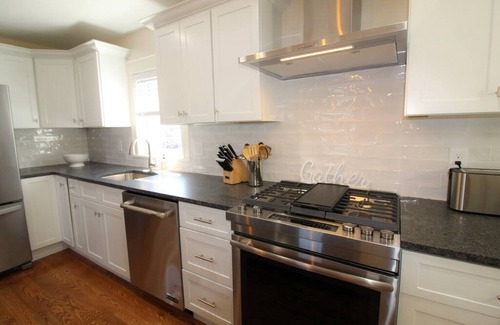- Spacious, fully stocked kitchen (dishes, silverware, cookware, drip coffee maker, microwave, kettle, fridge, dishwasher, gas range stove/oven) and complimentary startup coffee set up