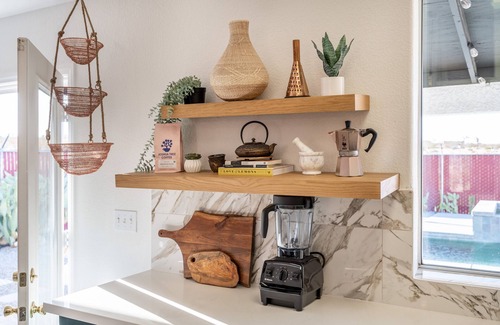 This home has been lovingly transformed into a modern, chic, desert dream. Designed to be a desert haven where you can truly getaway from the hustle and bustle of life and connect to the powerful energy of the desert. Rest and recharge in our restorative retreat. Inspired by the natural elements of the desert. Bringing in raw natural texture with jute rugs made in India. Hand crafted natural stone sinks flown in from Bali. A custom handmade live edge table made of monkey pod wood. Imported handcrafted wall hangings made by the indigenous artisans of Peru. Beautiful unique pendant lights made of natural elements; rope, wood, and metal to create a warm and unique ambiance in each room. Enjoy the gorgeous natural light that streams into the house throughout the day as well as the indoor-outdoor living with French doors in the dining room and master bedroom that open out directly to the private back patio, pool spa area.
