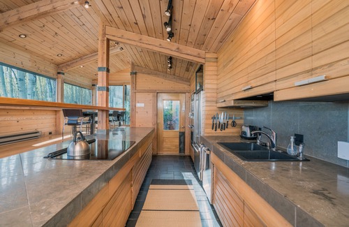 A gourmet kitchen comes stocked with all the utensils and kitchenware that you will need to make a great meal including a vita-mix, vermont castings grill and convection oven. The flagstone patio is a unique spot to enjoy a meal with friends while taking in the amazing view. The home is equipped with an 4 zone indoor/outdoor sound system to enjoy your favorite music while cooking and entertaining on the patio.