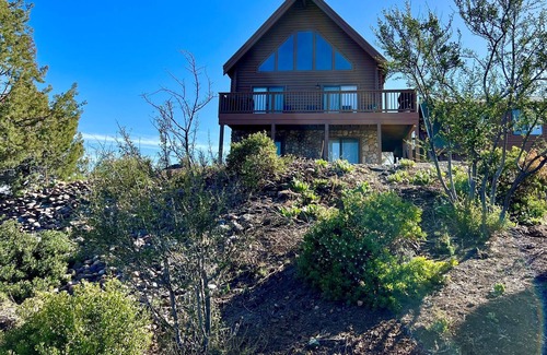 Mountainview Lodge is a beautiful cabin located just 9.6 miles or 22 minutes from downtown Prescott. This tall-pines property is everything you are looking for in your dream vacation in the forest. Mountainview Lodge has 3 bedrooms and 3 bathrooms and sleeps 7 guests. It's a 3-level home with exterior entry stairs. The step count is high but your fitness level will improve! On the main level you have 2 bedrooms - one with a queen bed and the other with a full/twin bunkbed. These bedrooms share a full, hall bathroom with a walk-in shower. The kitchen has an open-air design with tall ceilings and knotty-pine walls. A darling, tiled-in, wood-burning stove provides ambiance and additional warmth for cooler months. (Duraflame logs are preferred instead of real wood. This keeps safety and cleanliness better and more easily managed.) The kitchen is modern and cheerful with evergreen cabinets and country charm. It has a gas range/stove and is very well stocked with all dishes, pots and pans to satisfy the chef in your party. From simple snacks to gourmet meals, friends and family will be satiated and satisfied. The dining room has a polished-wood, 6-seat table with 2 bar stools for additional seating. Two sliding glass doors will get you out to the deck which has spectacular views. The deck faces north/east off the kitchen and wraps around to the north/west, offering long views all the way to Flagstaff and the San Francisco Peaks! This space is very usable from morning to evening for your first cup of coffee to your last sip of wine. Comfortable seating and a cute, little bar offers choices to everyone gathering outside to enjoy Arizona’s finest vistas. There is a gas grill for outdoor cooking. Propane is provided. Let’s go downstairs! This is where the fun begins. Child/dog safety gates are provided at the top of carpeted staircase to keep young children or pets from accessing the game room stairs. The lower level has a cozy couch and cow-print chairs around a large Smart TV. Smart TVs are a technological convergence of computers, televisions, and digital media players. A Smart TV can access the internet via Wi-Fi whereas a normal TV would need a separate device. A Smart TV also has built-in apps that are ready to login to with a subscription. (The main difference between a Smart TV and normal TV is that a Smart TV is smarter than a normal TV. Haha!) Sling TV has been set-up for complimentary Live TV. A mini wet-bar with sink and fridge will keep you from running up and down the stairs as you relax with your favorite beverage, movie or sports program. You can sit at the bar or may choose the darling whiskey barrel table. A pool table is in the adjoining room with another small, Smart TV and full bathroom with a walk-in shower. A sturdy dog crate is provided to keep pets safe and confined if unattended or sleeping. Another slider leads you outside to a concrete patio with tables and chairs. Games and puzzles are provided for family entertainment. The Primary Suite is on the upper level with a king bed and en-suite bathroom. This attractive bedroom has a cute little, south-facing deck for stolen moments in the early morning or late at night. The bathroom is spacious with walk-in shower and double-vanity sink. Wi-Fi, washer/dryer, A/C and Central Heat bring modern conveniences to country living. Mountainview Lodge has a well that is supplemented with hauled water in a tank. We ask that you conserve water and utilities as a respectable guest. Whether it's quick get-away weekend or your whole summer, Mountainview Lodge represents Prescott's forested mountain accommodations at their finest!