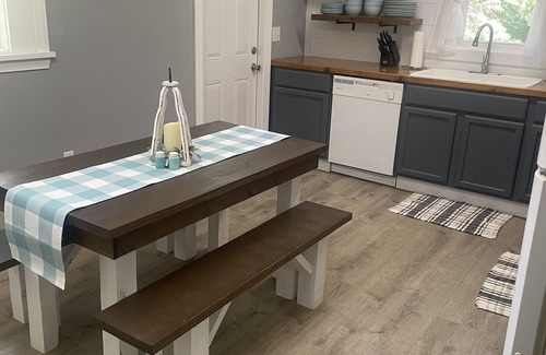 Newly remodeled private modern farmhouse with easy access, nestled amongst the trees in a quiet neighborhood with rocking chair front porch to sit and listen to the Cullasaja River and enjoy a cup of morning coffee! Also enjoy the serene outdoors right in the heart of the Blue Ridge Mountains just minutes from downtown Franklin and Highlands/Cashiers. The waterfalls are a must see! This house sits right above the Cullasaja river so the sound of the rapids is in your back door! During the fall and winter you will have views of the river from the porch! We are just minutes from area attractions If you enjoy hiking, waterfalls, gem mining, snow tubing, rafting, fishing, riding motorcycles, and beautiful scenery this is the place for you!