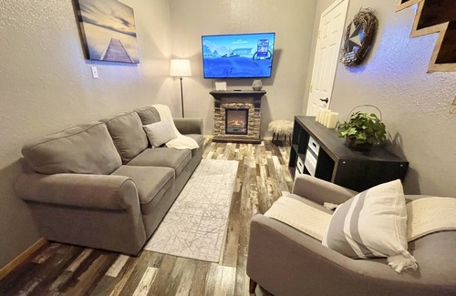 Welcome to Holder Guesthouse! This 3 bedroom, 2 bath - 2 story townhouse style home is brand new and the perfect getaway for a small family. The master bedroom has a comfy King Sized bed with walk in closet, private balcony and an en-suite bathroom complete with beautiful clawfoot tub. All 3 bedrooms are upstairs and have smart TVs with WiFi. A queen size sleeper sofa w/foam mattress is available downstairs in the living room. Guests also have a private patio with bar & seating area and access to the main backyard oasis where there is a pool, hot tub, gas firepit and propane BBQ grill.