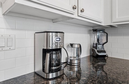 Downstairs, enjoy a king ensuite bedroom with a brand new Smart TV, a spacious bathroom with separate shower and tub, and a large walk-in closet. You'll also find a bunk bed room, a twin room with a desk, a half bath, and an open-concept living area with a large Smart TV and fireplace. The fully stocked kitchen includes granite countertops, stainless steel appliances, a breakfast nook, and a large formal dining area.