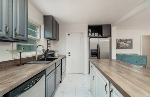 The kitchen downstairs, has an even bigger island and is equipped with all the same essentials you would need for that Thanksgiving feast!