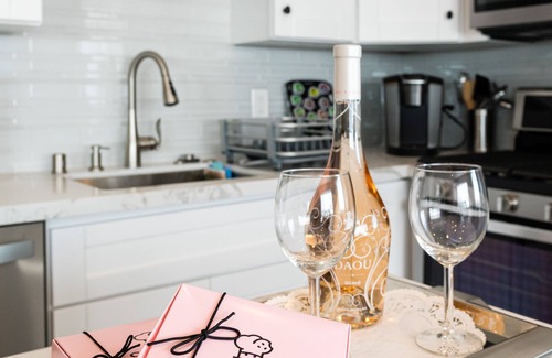 Large Private Deck, Fire Pit Table, Gas barbecue grill. One king bedroom with connected full ensuite bathroom with double sinks, robes, closet, luggage rack, hangers, hamper, chair and smart Samsung TV. One queen bedroom with full ensuite bathroom, closet, hangers, hamper, luggage rack and smart Samsung flat screen TV. Full kitchen and living area with queen pull out sofa couch. View of San Diego Bay and downtown from kitchen/living area. HVAC and free private washer/dryer.
