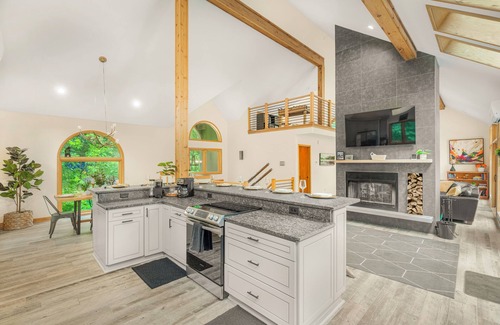 Welcome to the Mountain Treehouse! We recently renovated the home with all upgraded amenities, including a brand new hot tub, barrel sauna, fire table outside, and two-sided wood burning fireplace inside. The home is nestled in the tree tops, with oversized windows allowing natural light to fill the space, and has fantastic privacy. Vaulted two story ceilings make the home feel wide open and spacious. Plus, pet friendly! Managed by Chris at New School Hosting. (NOTE: video of property was taken before several recent updates, including a deck expansion with addition of hot tub, sauna, and fire table, plus bedroom upgrades)
