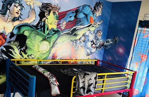 This art filled home has amazing themed rooms for many to enjoy. One room will take you into a trip to the tropics or Hawaii. How about taking a quick trip to New York and swinging in to visit one of the many superhero’s! Glam squad where are you because this master will make you feel like a million bucks! As my greatest room is my unique all red room, yes you heard that right! Along with unique decor!